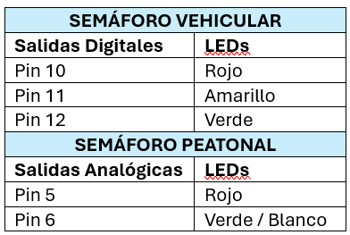 Realizar una maqueta de un cruce peatonal que conste de dos semáforos: Uno peatonal, otro vehicular. El circuito debe estar conectado con los siguientes pines: