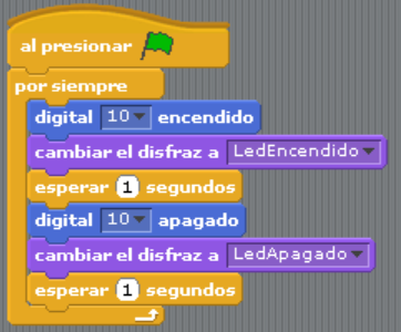 Ahora vamos a realizar el programa en S4A, recuerda conectar la placa al puerto USB y comprobar si existe comunicación. Haz clic en los siguientes enlaces para descargar los disfraces que utilizaremos en el programa: LedApagado y LedEncendido