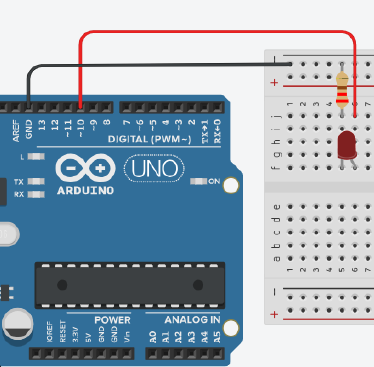 Vamos a desarrollar el mismo ejercicio que en el tema anterior, pero ahora en vez de usar el LED integrado (Pin 13), utilizaremos el pin 10 como salida digital. Para ello, utilizaremos los siguientes componentes: 1 LED, 1 resistor 220ohms, cables m/m, protoboar y tarjeta UNO con cable USB.