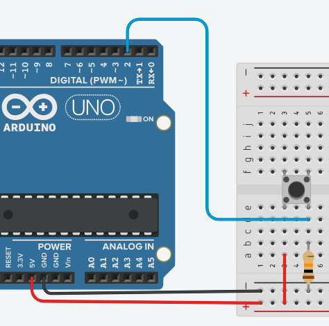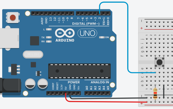 - Conectar un cable (azul) desde el pin digital 2 alineado entre el resistor y el lado positivo del pulsador.