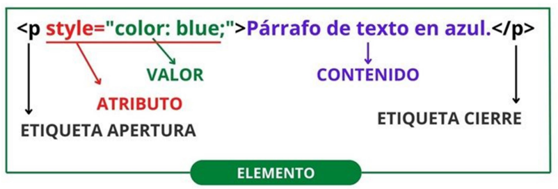 - Contenido: Es la información que se encuentra entre la etiqueta de apertura y la etiqueta de cierre del elemento. Ejemplo: <p>Este es el contenido del párrafo.</p>